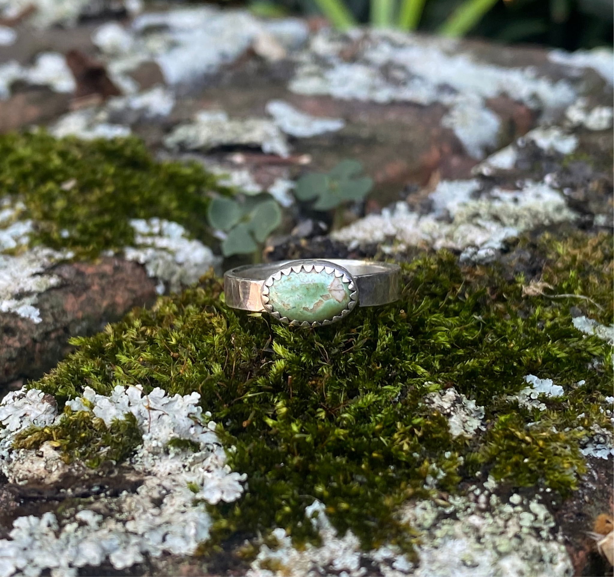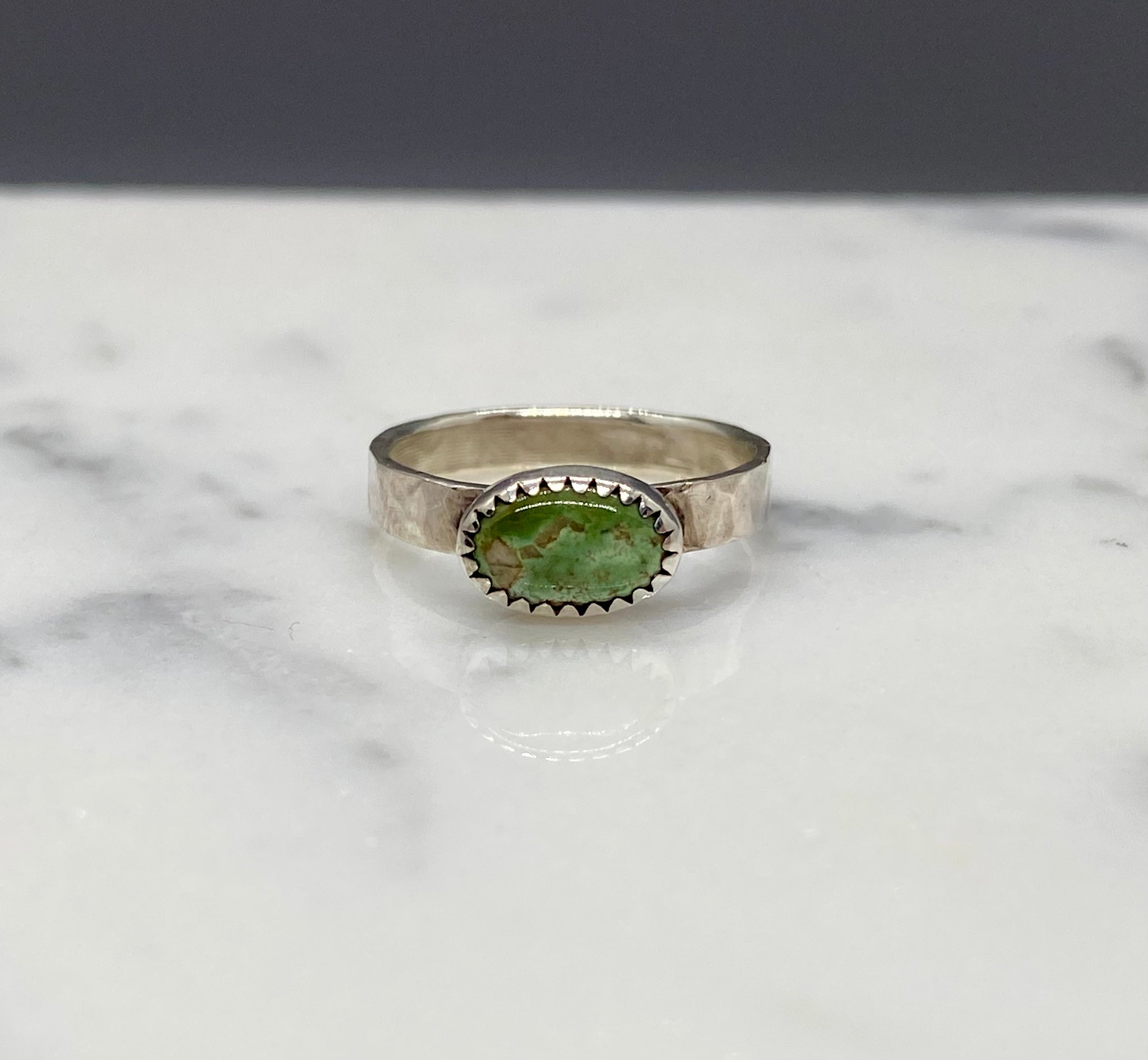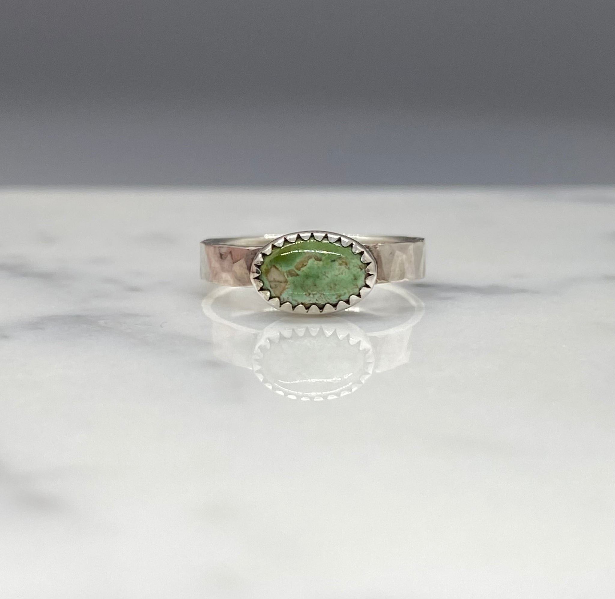 This Green Tree turquoise ring, set on a hammered sterling silver band, is perfect on its own or could be part of a stacking set.