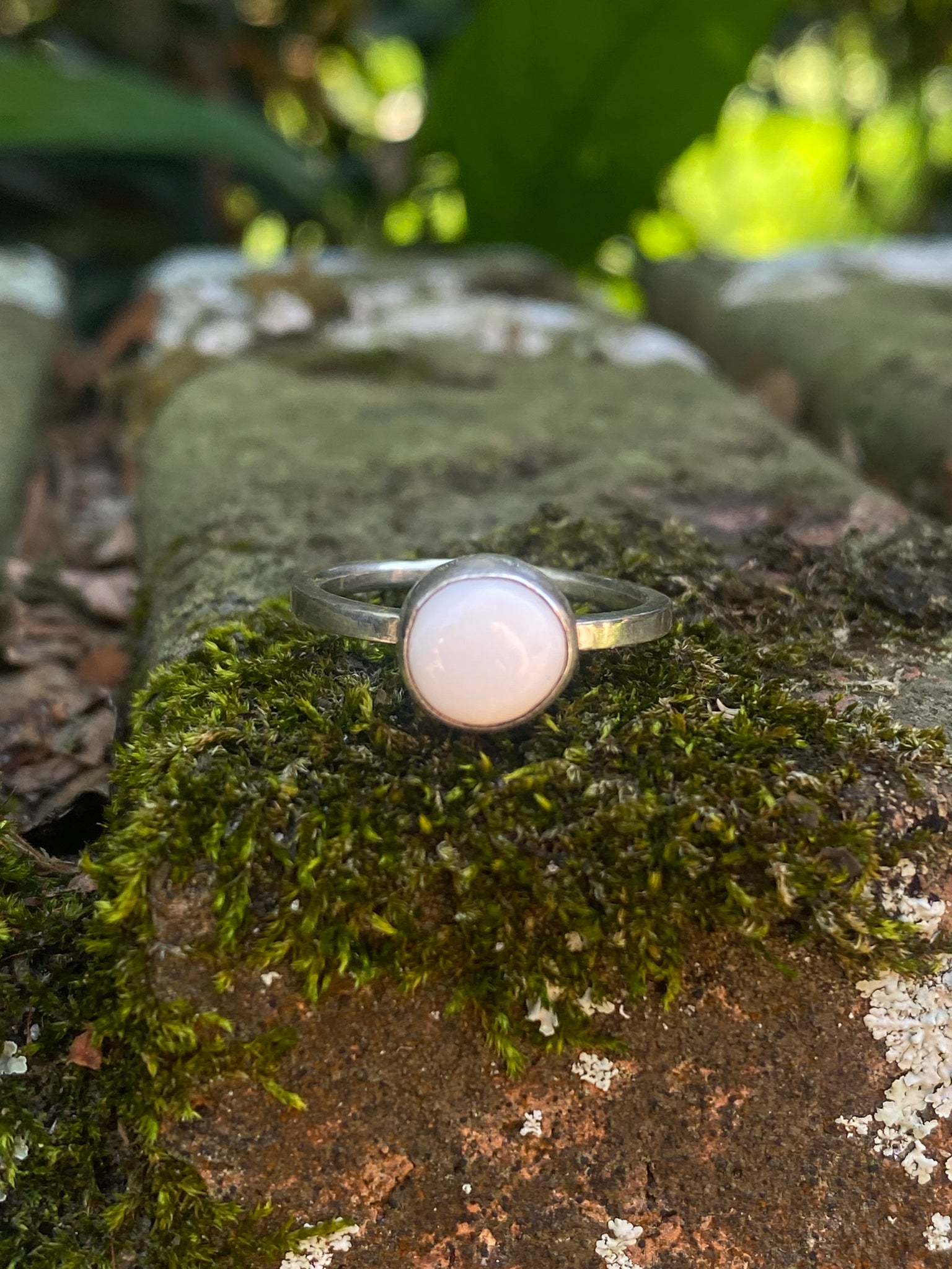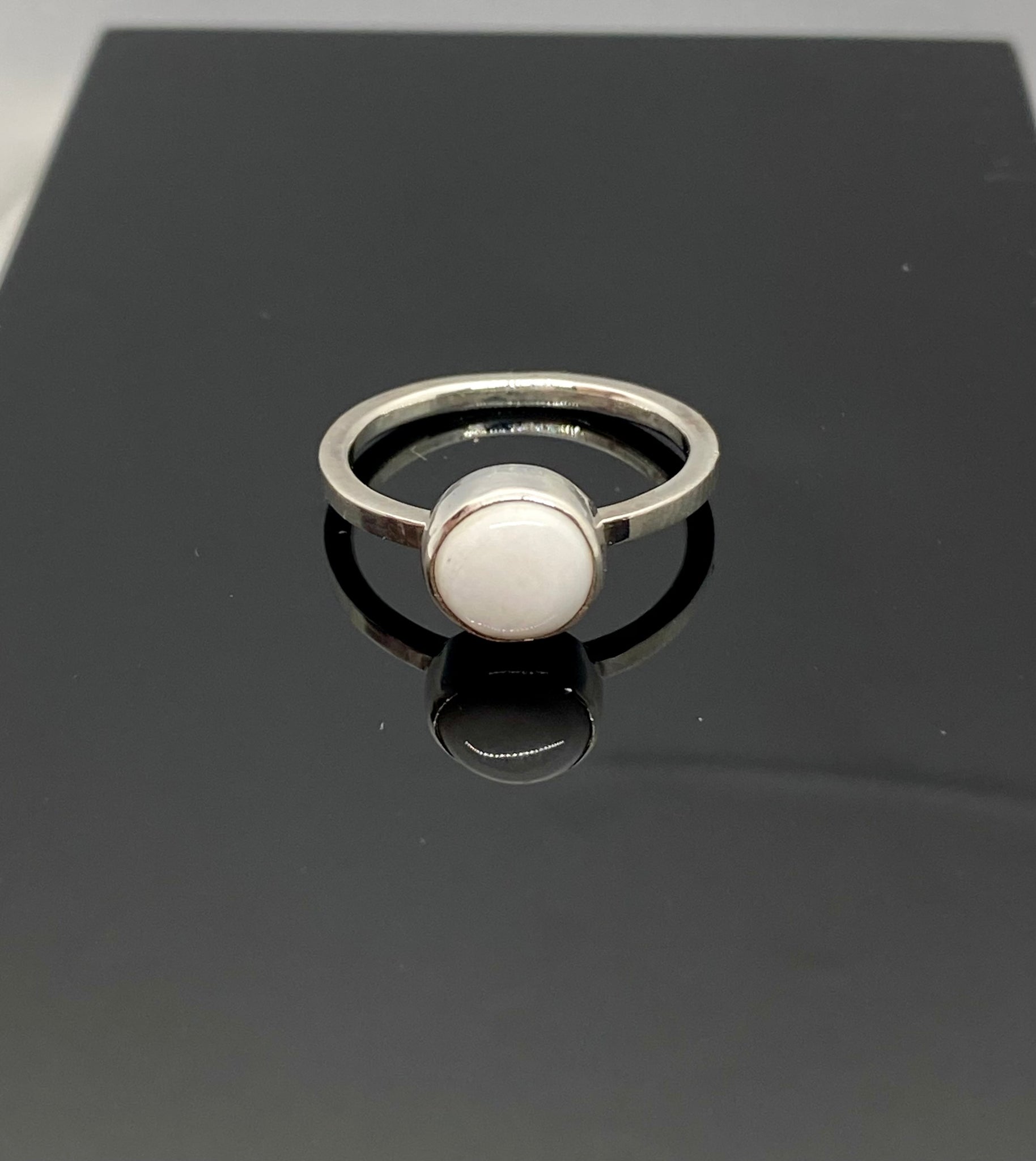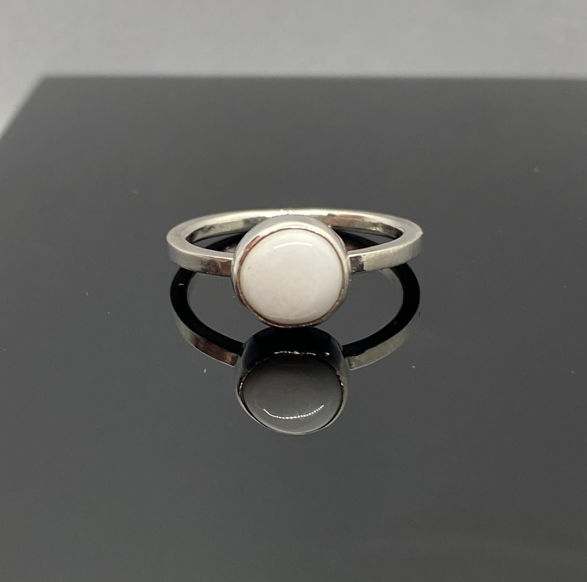 This solid white White Buffalo stone is ready to be paired with almost anything. Set in a fine silver bezel it rests on a sterling silver band made from square wire that's been updated with more comfortable rounded inside edges.