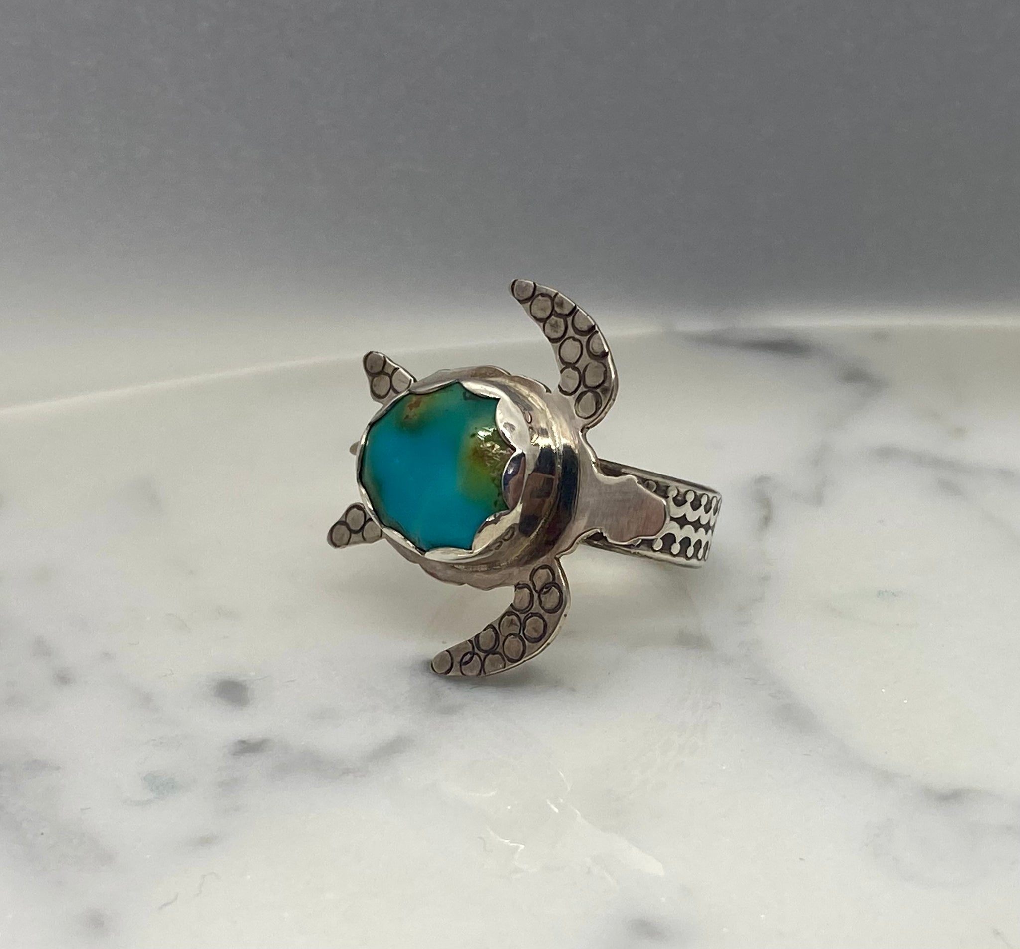 This handcrafted ring features a beautifully detailed sterling silver sea turtle, with a vibrant blueberry turquoise stone set at its center. The turquoise showcases rich blue tones with subtle natural matrix patterns, reminiscent of tropical waters. The custom bezel setting follows the contour of the turtle’s shell, adding texture and dimension. Playful yet elegant, this ring captures the spirit of the ocean and highlights the natural beauty of the stone—perfect for ocean lovers.