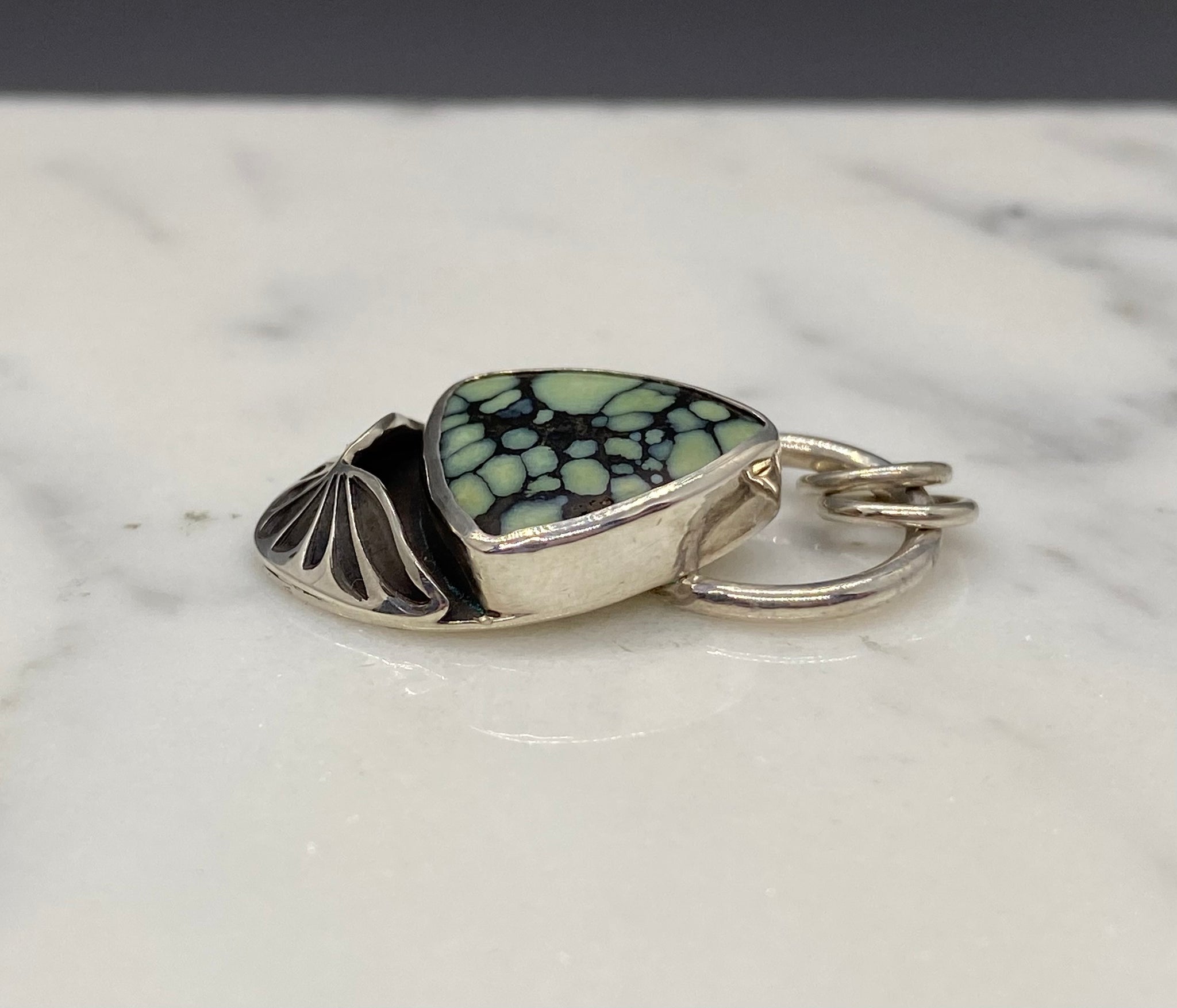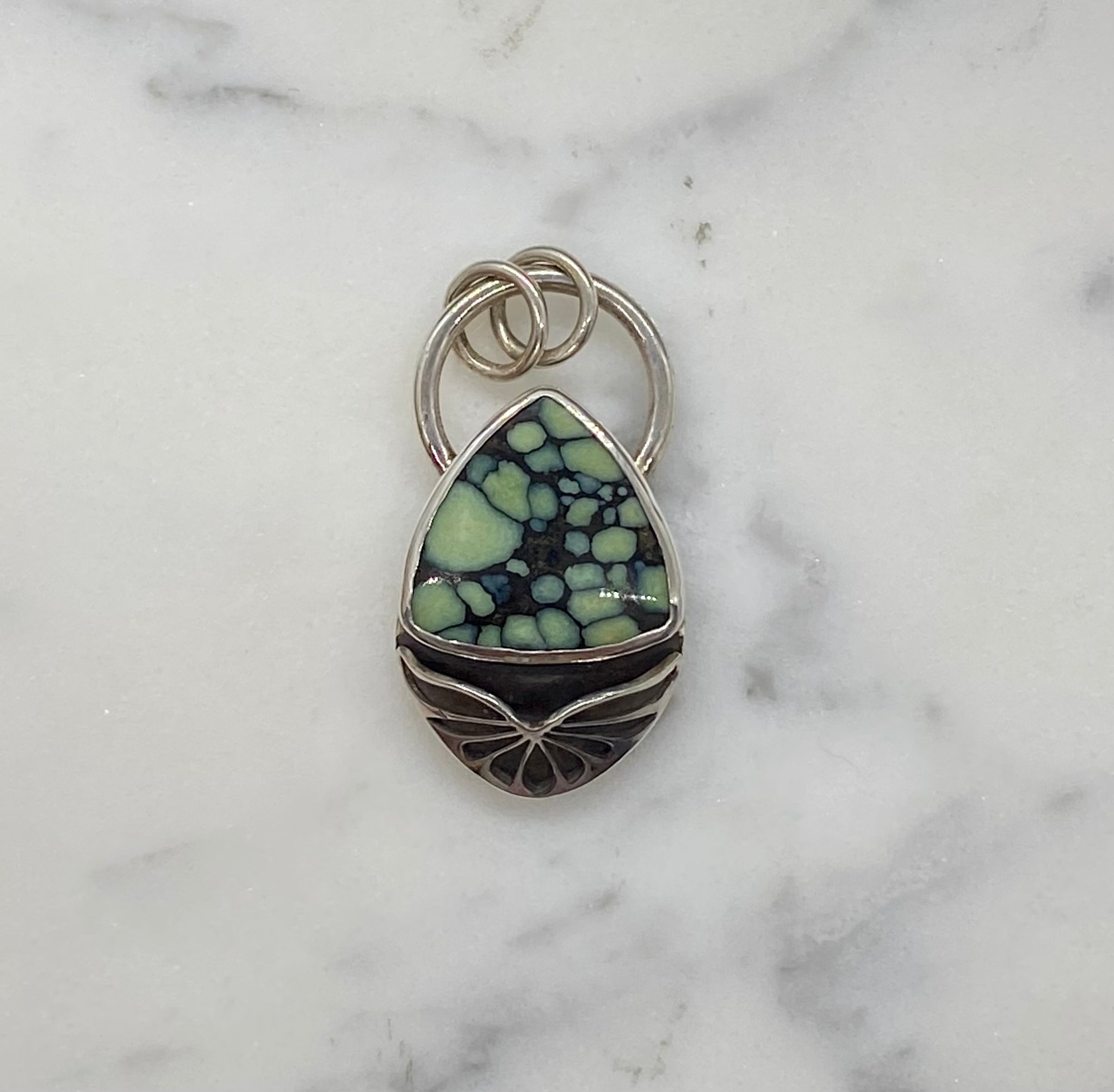 This pendant features a trillion shaped Desert Bloom Variscite, known for its calming minty-green hues and striking webbed matrix. Below the stone is a raised, hand stamped floral-inspired motif, evoking the bloom of desert flora. Two silver rings crown the pendant, offering a graceful and versatile connection point for your favorite chain or cord. Comes with a 20" sterling silver chain.