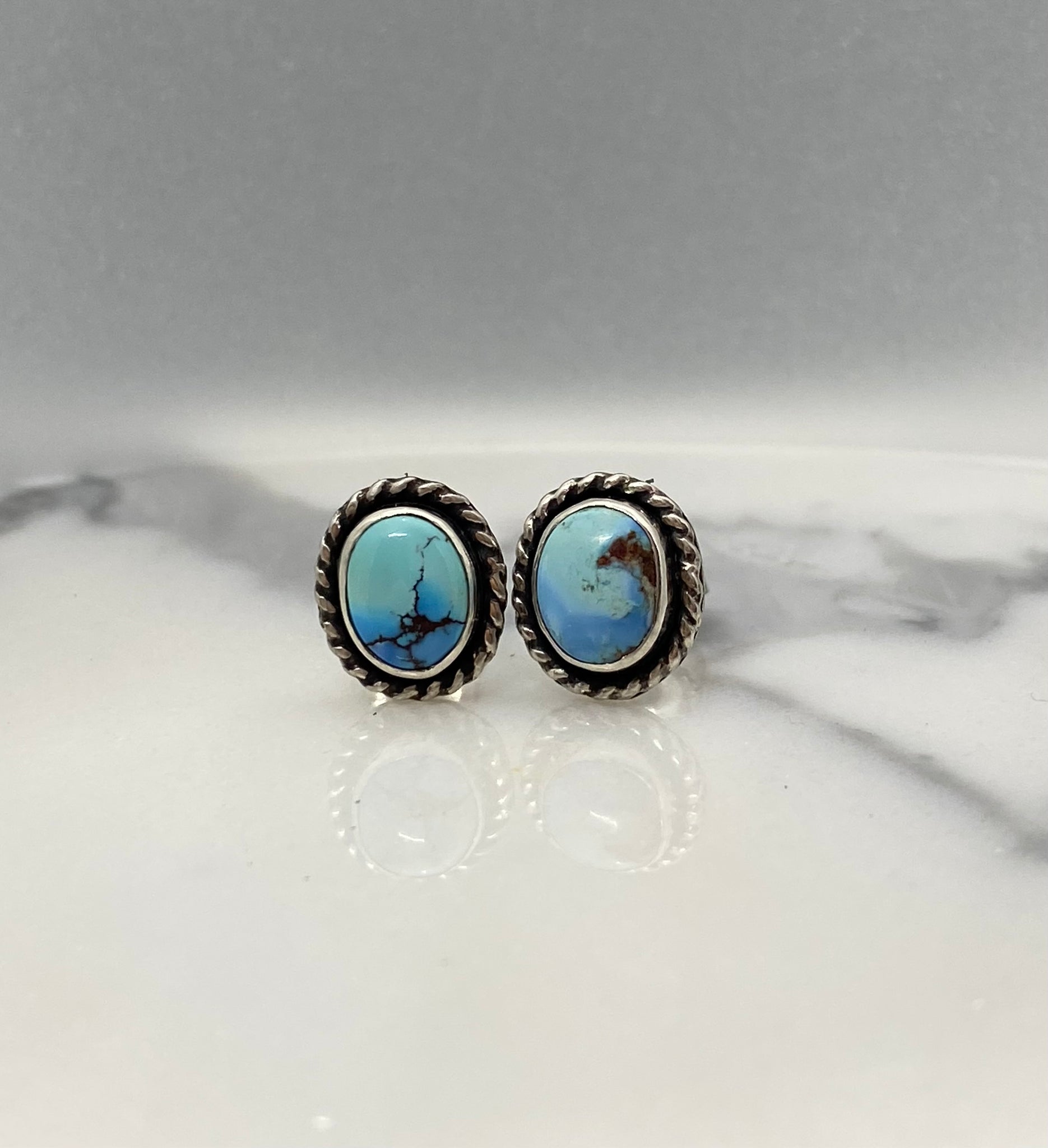 Get ready to add a touch of playful charm to your everyday wear with these turquoise studs. These charming earrings, with sterling silver posts and backs, feature a twist wire border and stunning Golden Hills turquoise, making them the perfect accessory for any outfit.