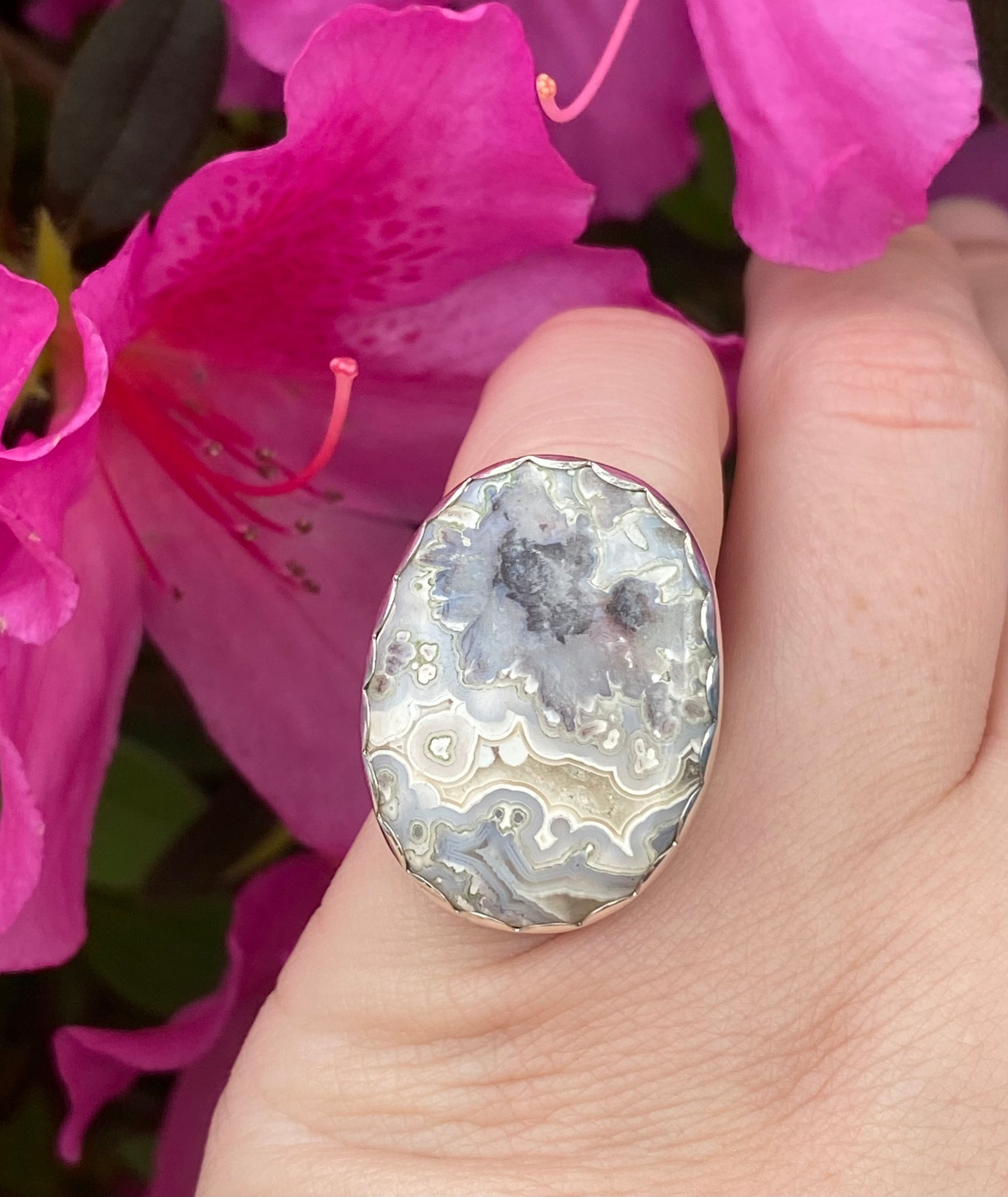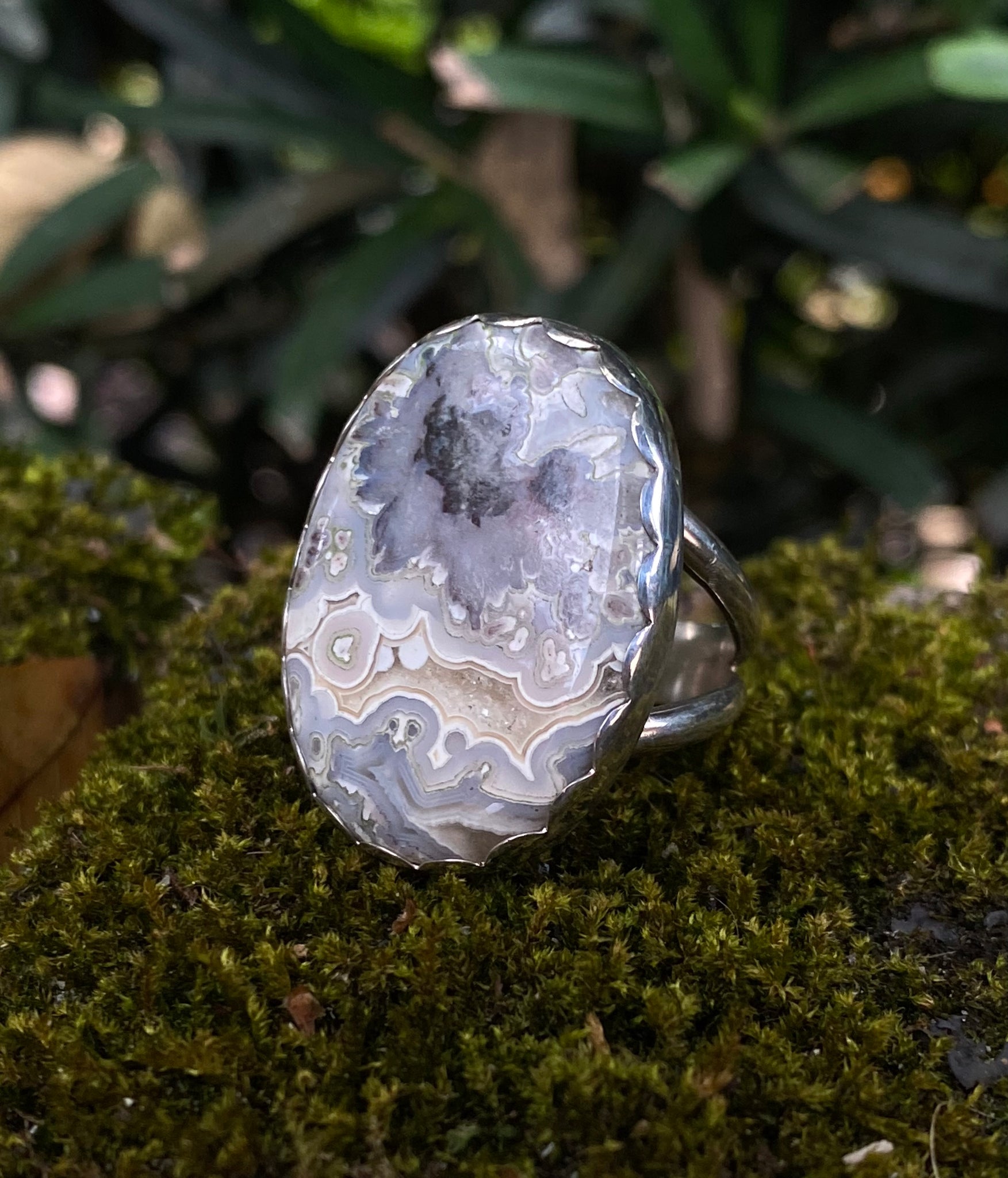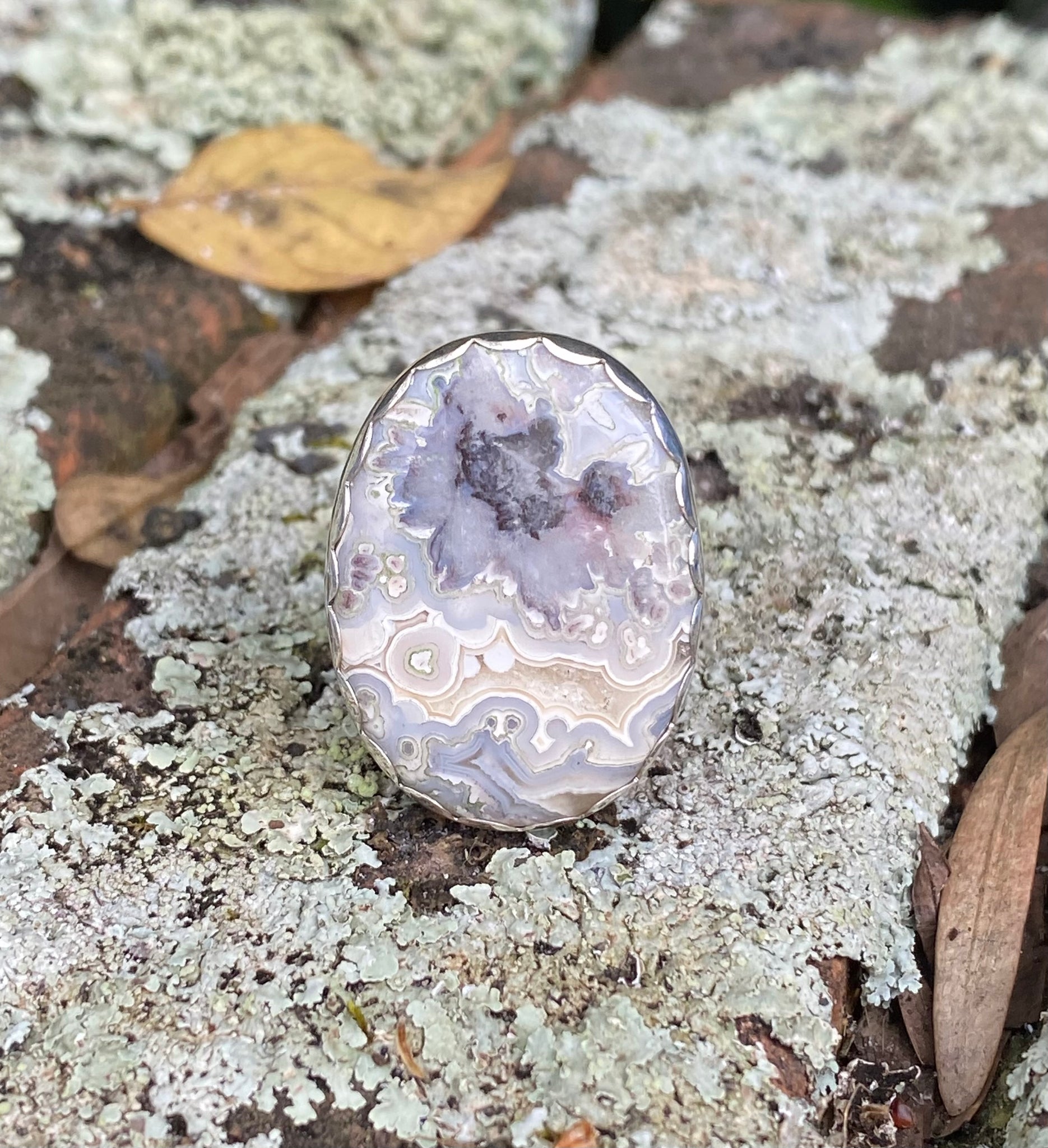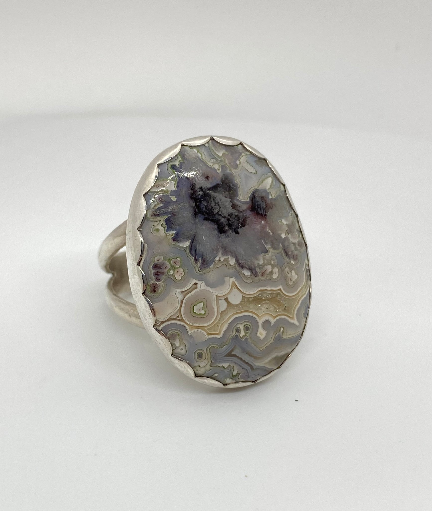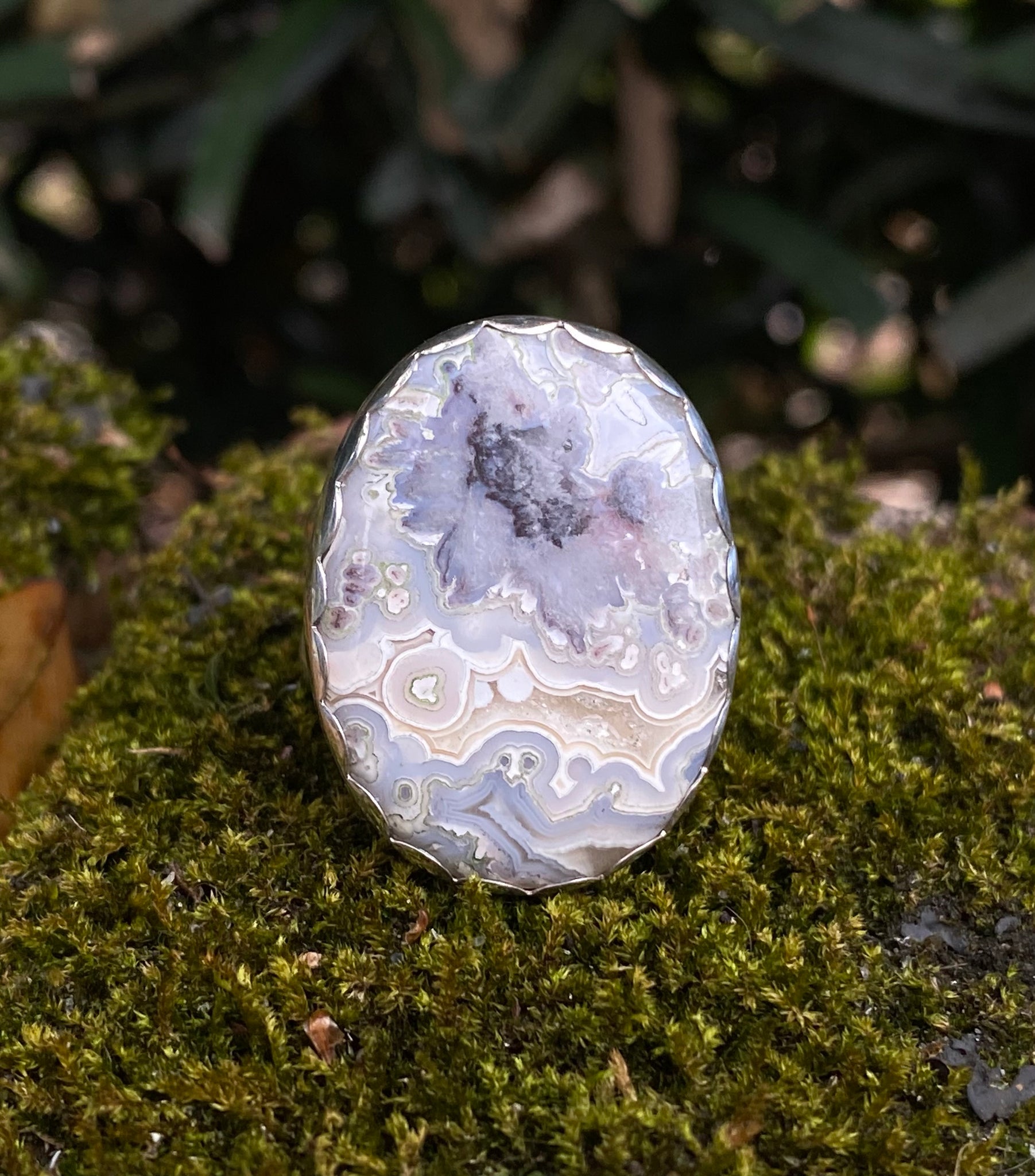 Reminiscent of a watercolor painting, this stunning crazy lace agate features a natural druzy pocket surrounded by swirls of purple and cream. The scalloped edge of the bezel complements the patterns in the stone.