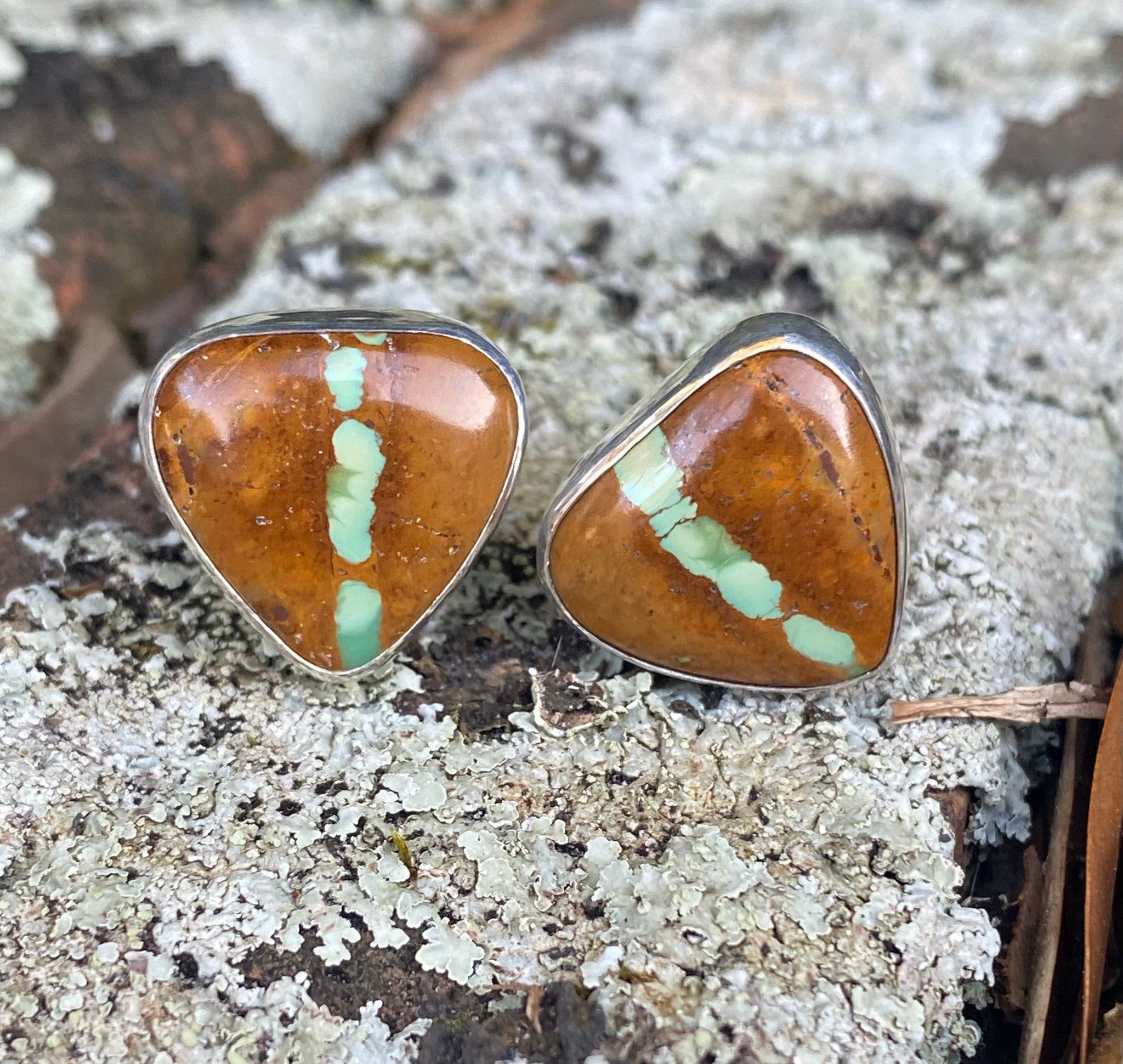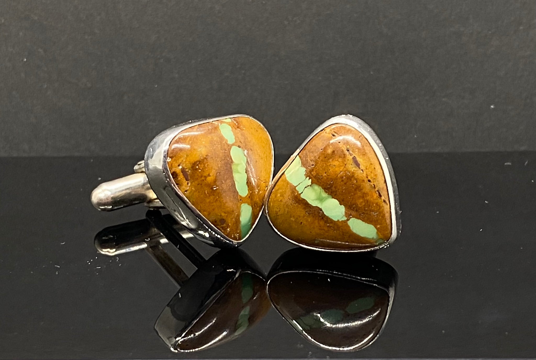 These unique cufflinks feature Royston ribbon turquoise set in custom made bezels. The bezels and toggle backs are all sterling silver.