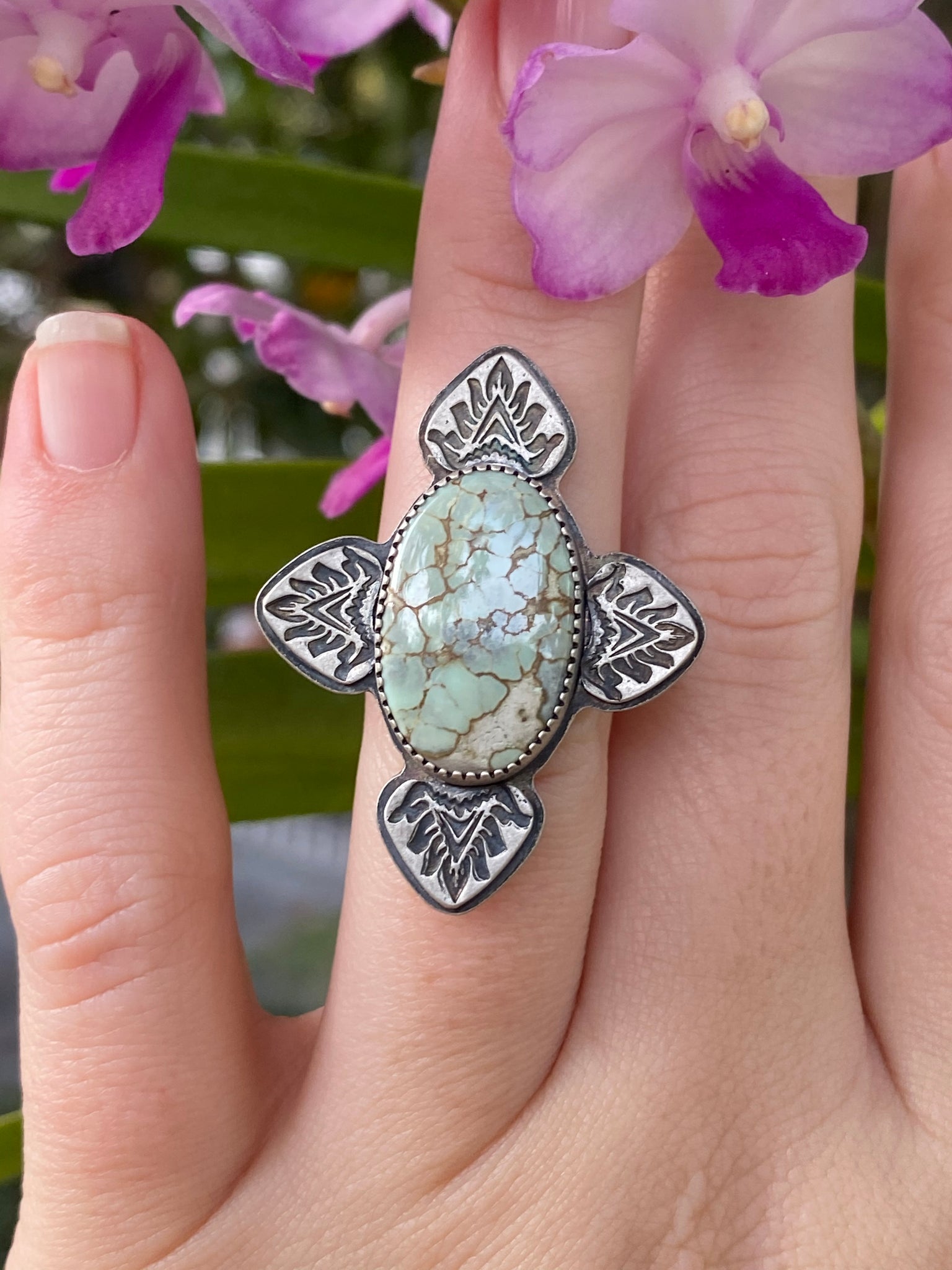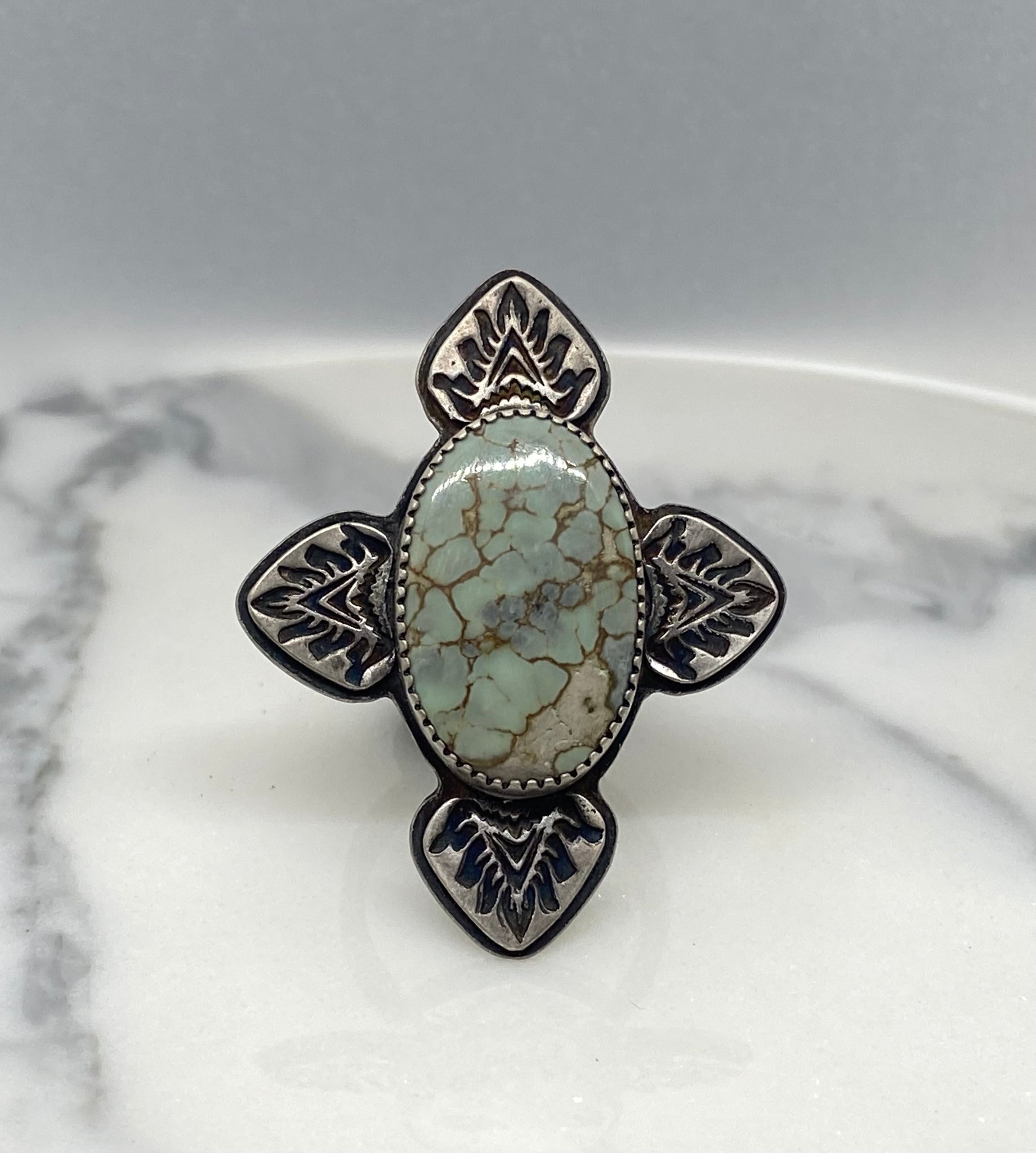 This bold Silver Peak variscite shield ring is made of sterling silver and adorned with hand stamped accents. The dark matte finish was achieved by the patina process followed by tumbling to enhance the stamped features, textured band and sage green stone. Silver Peak variscite was a small mining claim that was hand dug by a husband and wife team.