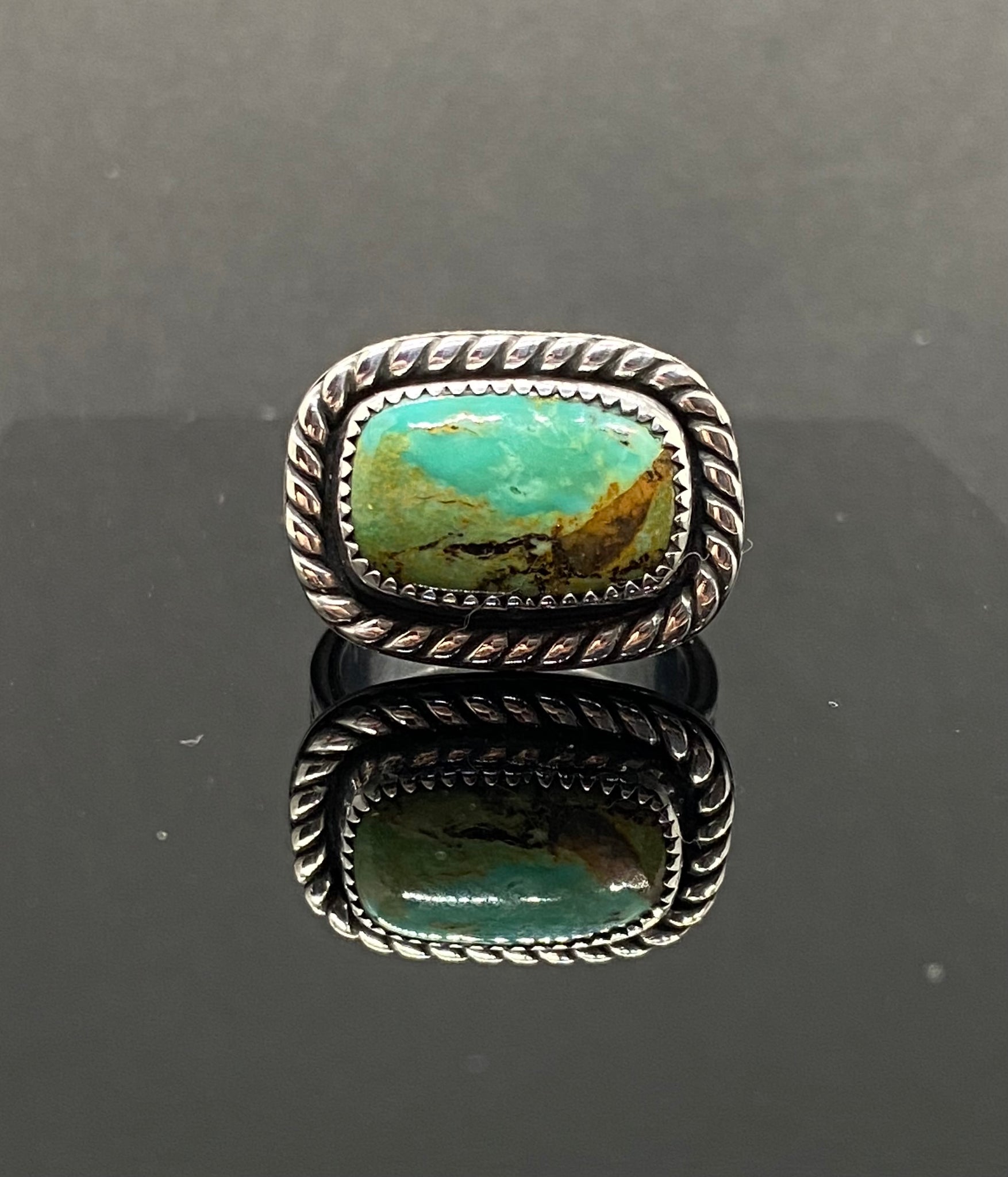 Mined in the Baja Peninsula, this gorgeous sky song turquoise cabochon features a unique landscape image painted over time by nature. A patina solution was applied to the bezel and the band prior to setting the stone and was selectively polished to highlight the texture of the metal.