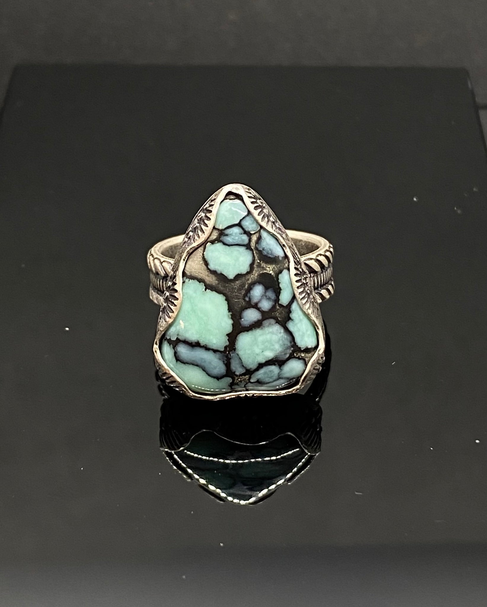 This high-grade desert bloom variscite is set in a free form hand stamped bezel on which a patina has been applied to highlight the stamping. The overall setting and band are in a matte finish.