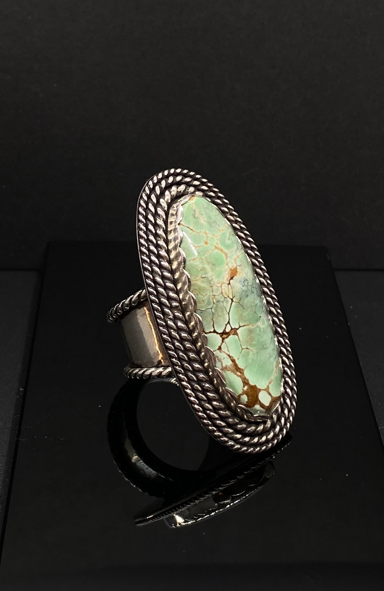 This ring is definitely large and in charge - the ultimate statement piece. The sage green variscite with a warm brown matrix is encompassed by my signature Sweet P* triple border style. The custom wide band was designed to support the size and weight of the setting.