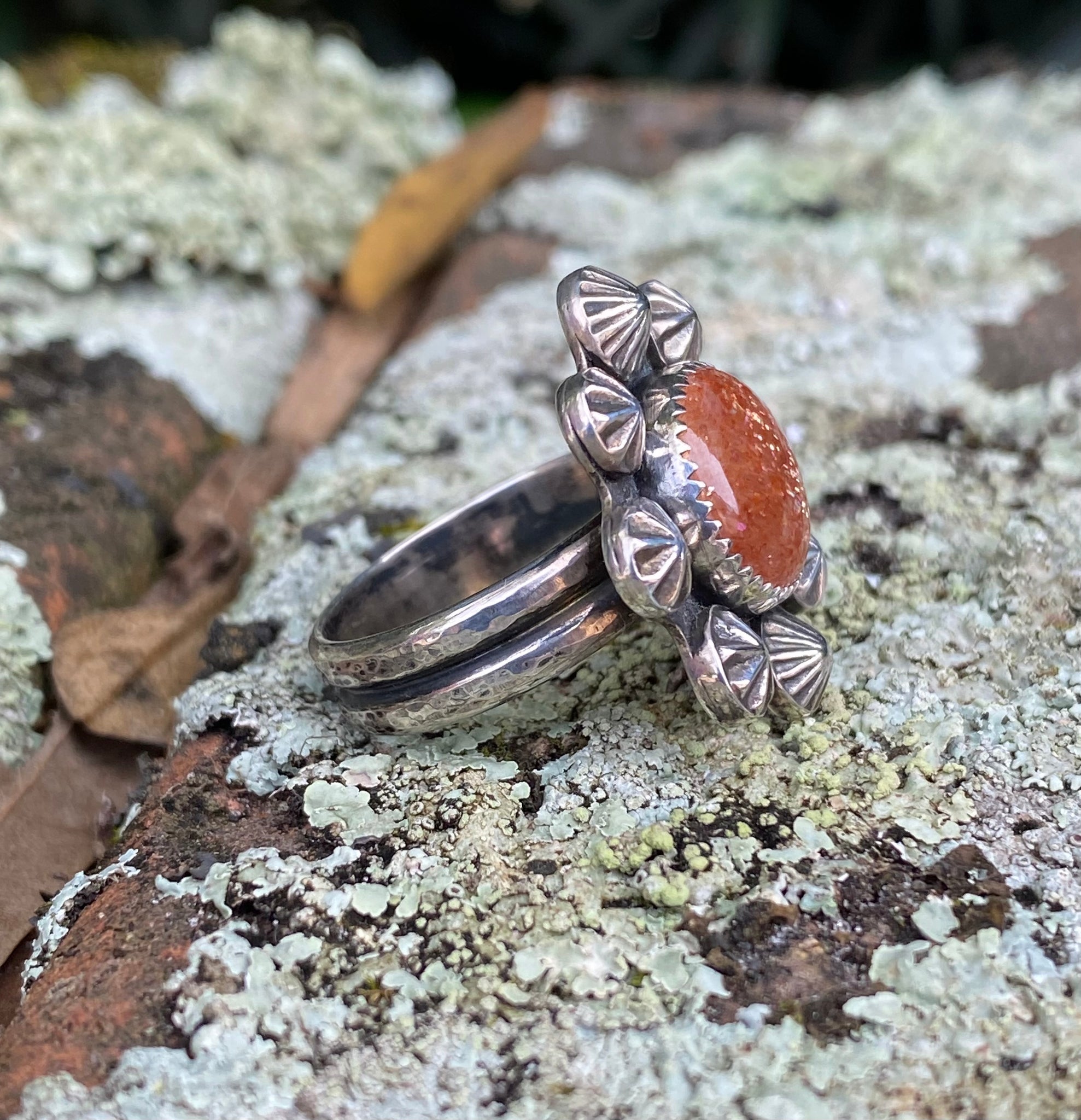 Sunstone is a natural gem with copper inclusions called "schiller" which gives it a glittery or confetti look. This cabochon is set in a serrated bezel surrounded by hand made silver shot embellishments.