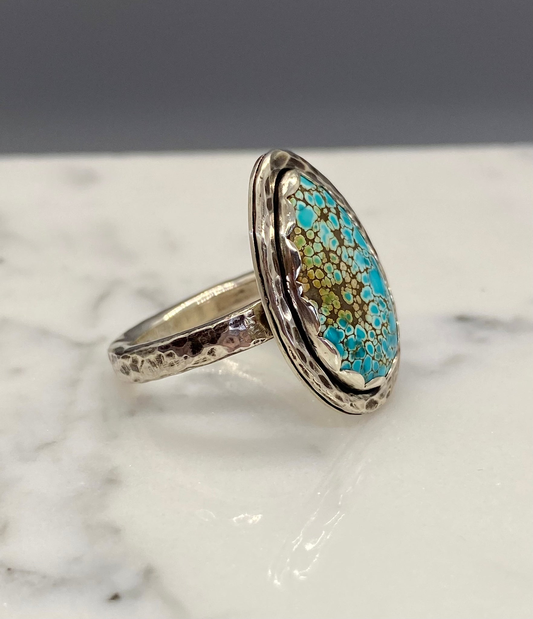 This eye-catching ring features rare Nevada-mined Thunderbird turquoise with vibrant polychrome patterns. Handcrafted in sterling silver, this bold piece is finished with a distinctive hammered border complemented by the hammered band, blending traditional southwestern charm with modern elegance.