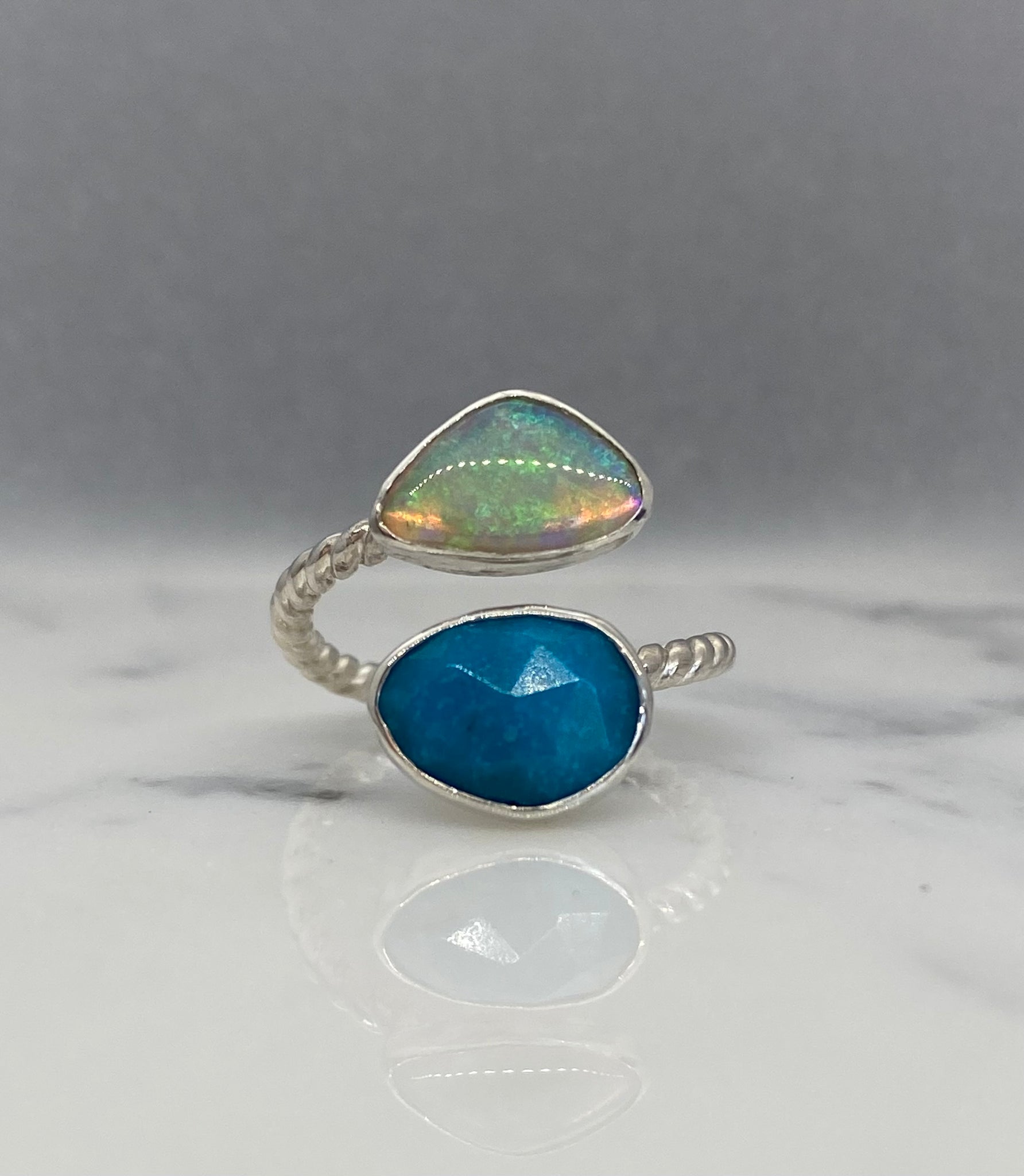This open-shank ring features a fun pairing of stones - a rose-cut turquoise and a shimmering Australian opal set in sterling silver. The turquoise offers a vibrant, earthy pop of blue, while the opal flashes with iridescent colors that shift beautifully in the light. The open shank design gives the ring a slightly adjustable nature, but it shouldn't be sized more than half a size up or down. Once you found your size the ring shouldn't be readjusted as this can put stress on the band.