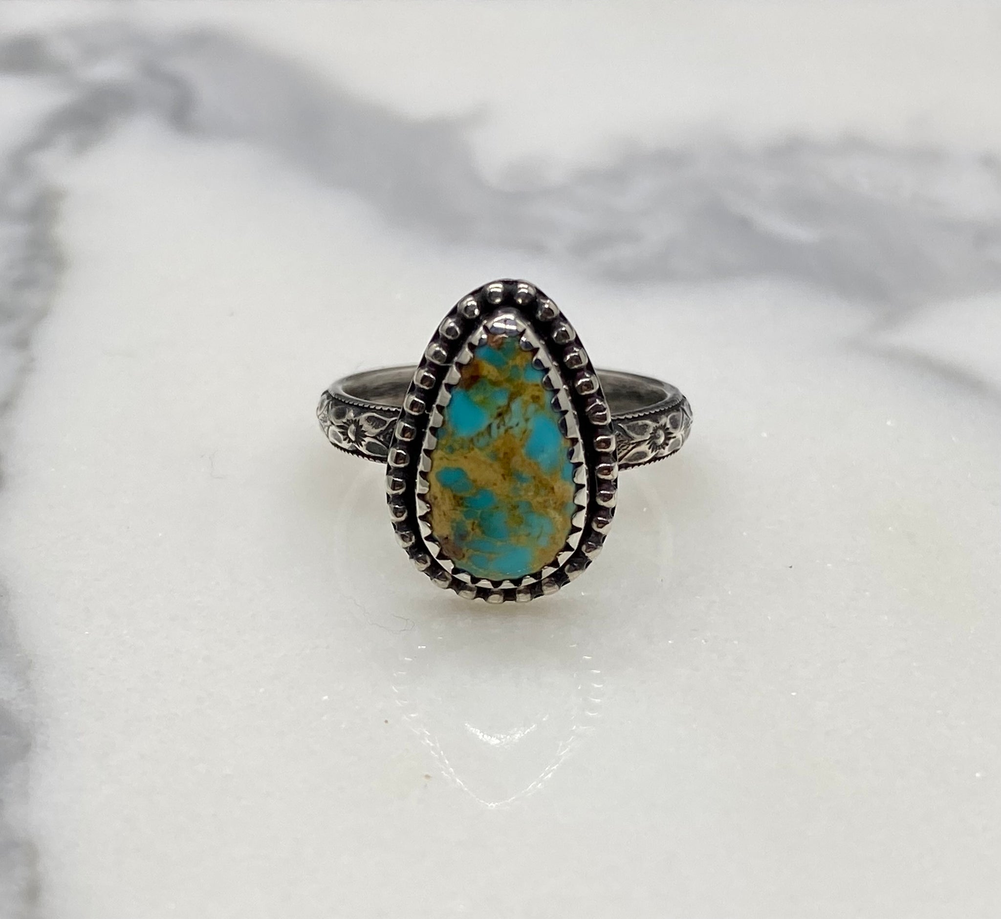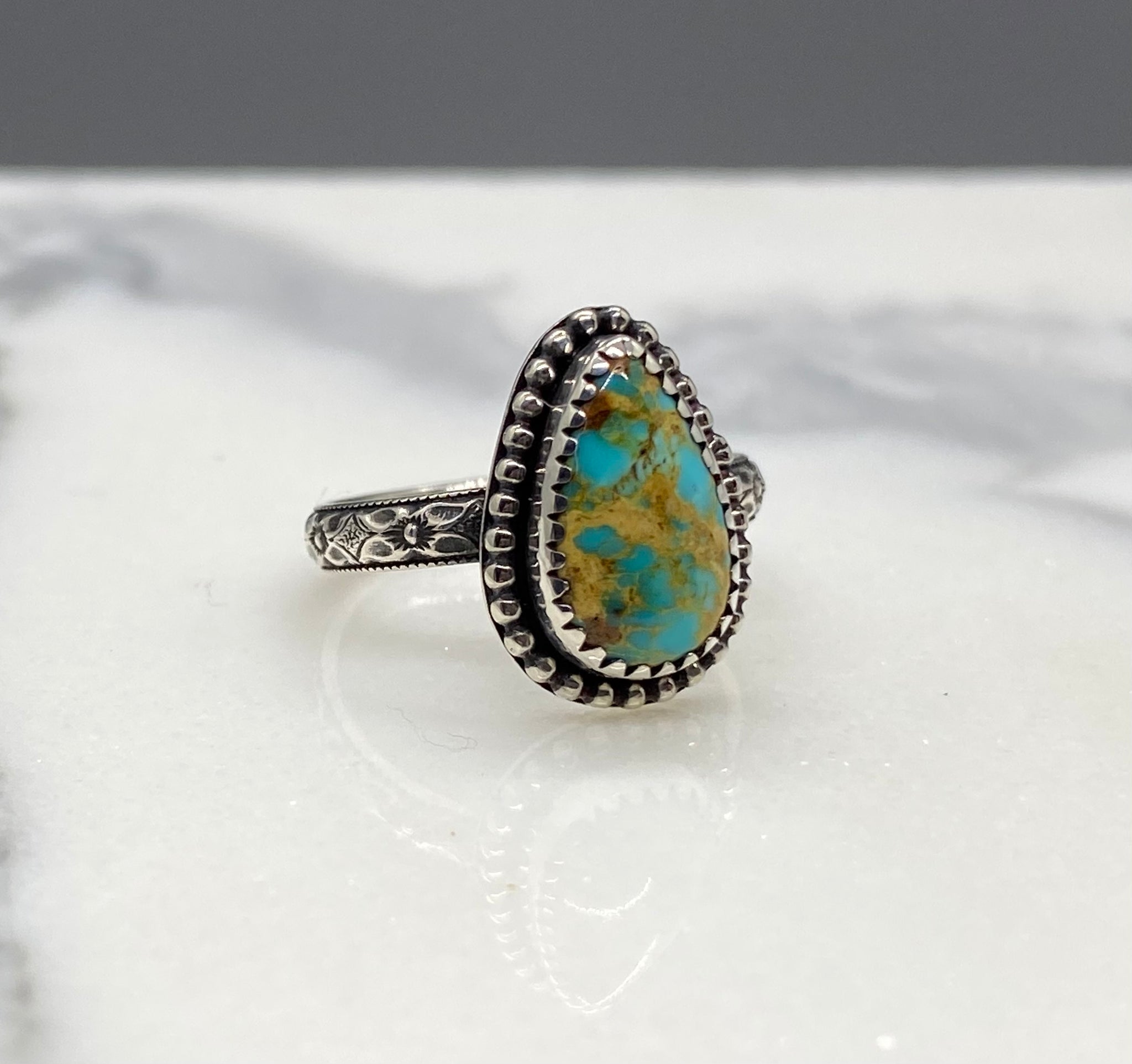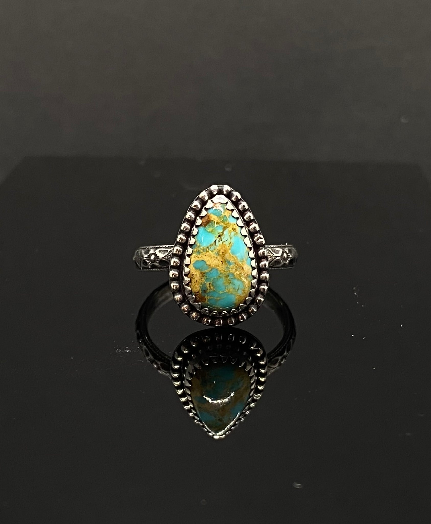 This Rising Phoenix turquoise is from the Kingman mine in Arizona. The teardrop shaped stone is set in a serrated bezel and bordered by bead wire.