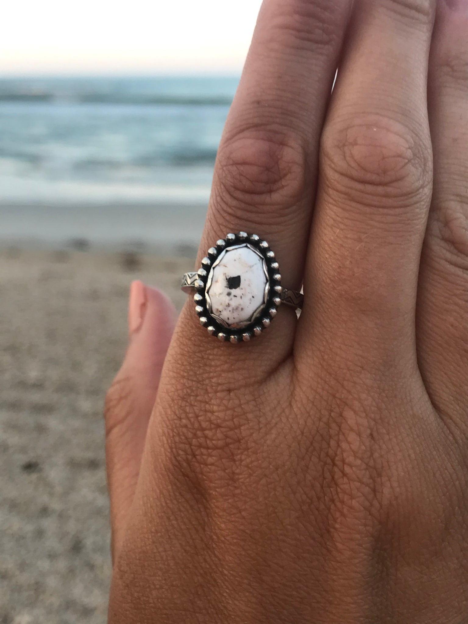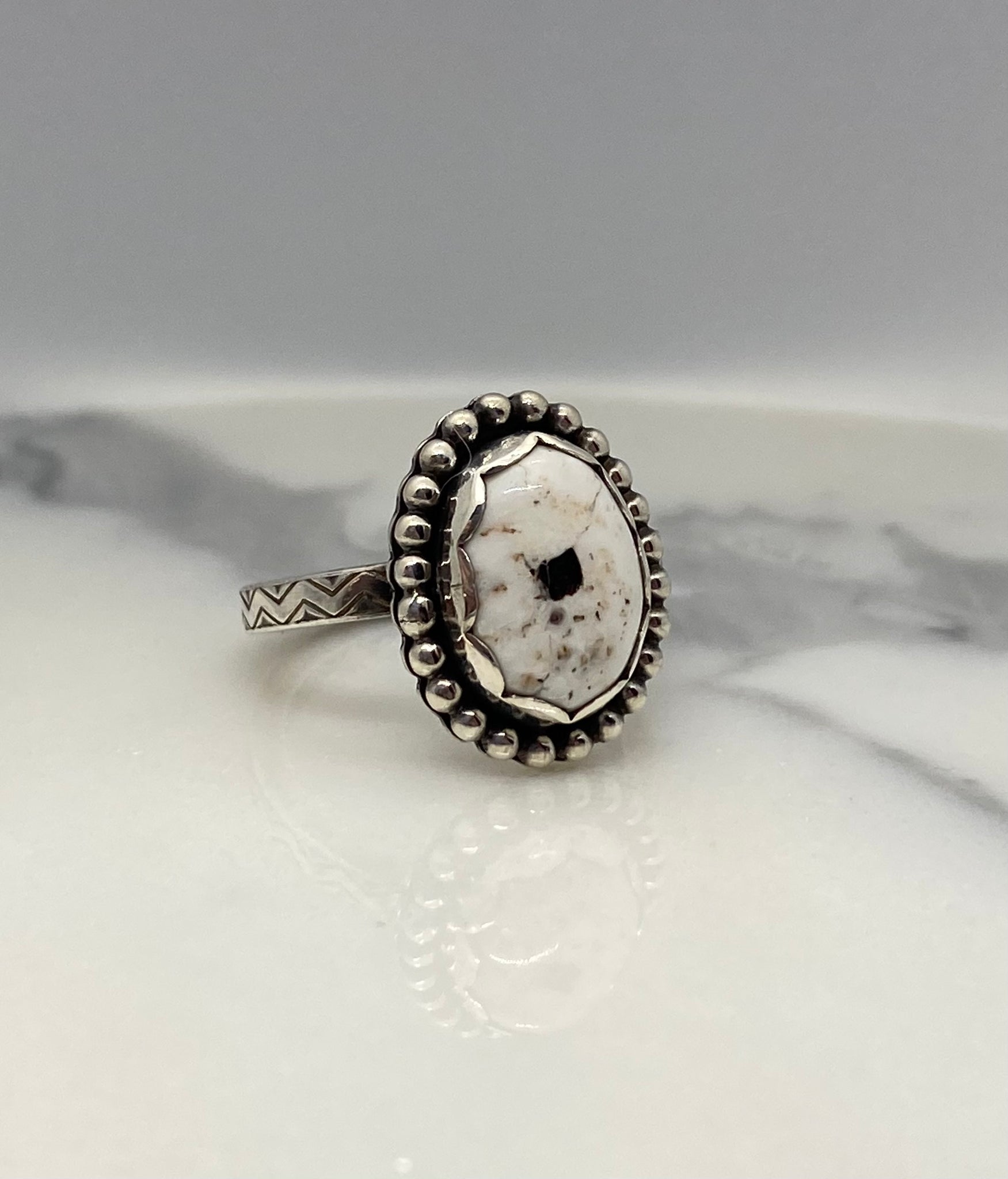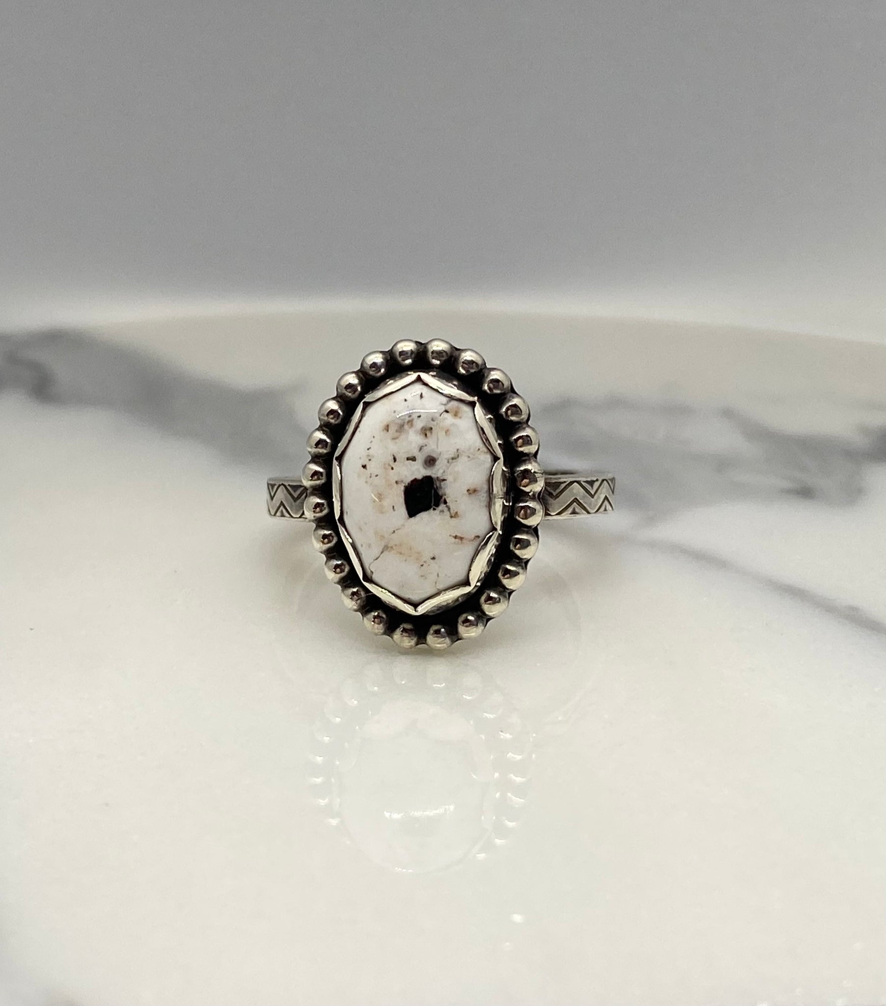 Mined in Tonopah, Nevada, this White Buffalo cabochon features a predominately white background with a centralized black focal point. This stone is set in a scalloped bezel and is complemented by a beaded border and a scalloped back plate.